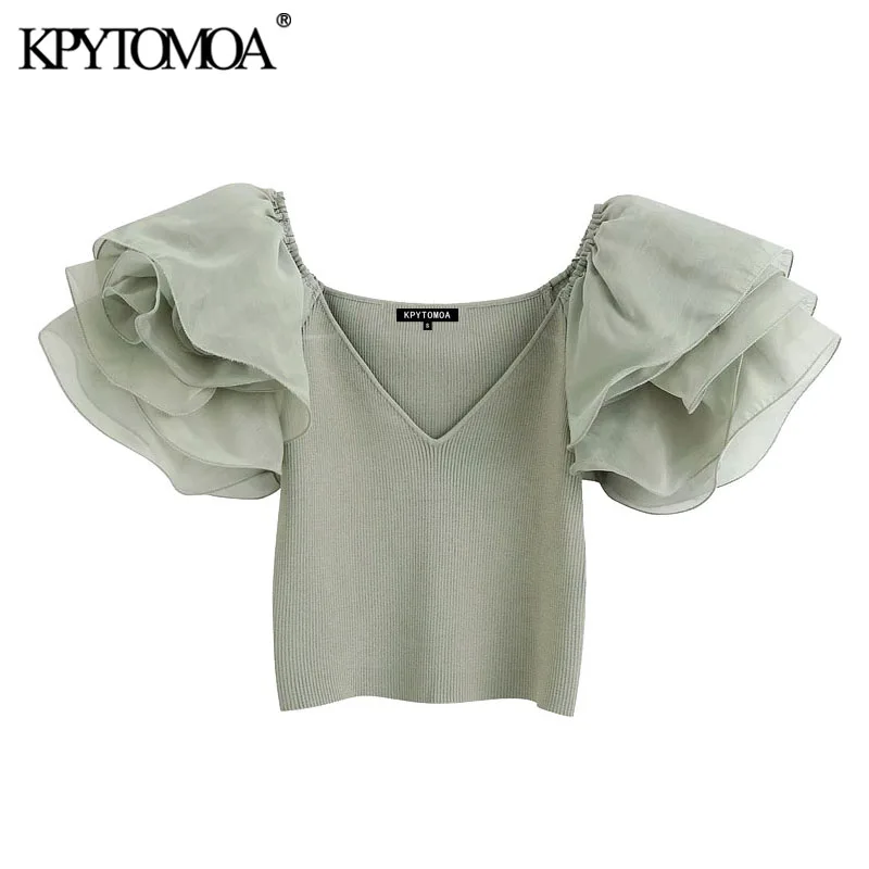 KPYTOMOA Женская мода 2020 с органзой трикотажные укороченные блузки винтажные прозрачные рукава стрейч тонкие женские рубашки шикарные топы