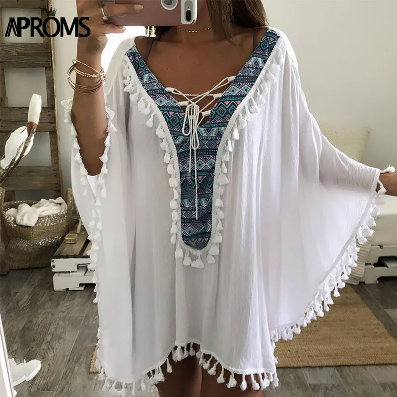 Женская пляжная туника Aproms Enthnic, белая туника с треугольным вырезом и принтом в стиле бохо, бикини, большие размеры