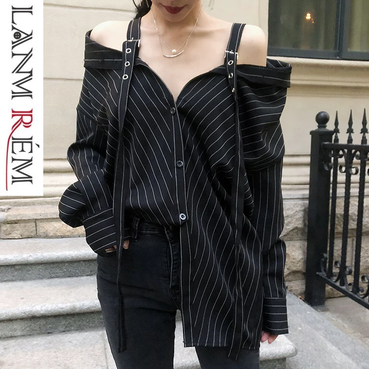 LANMREM 2019 Новая мода Личность черный ремень вертикальная полоса с открытыми плечами длинный рукав рубашка женская блузка Vestido YE22801