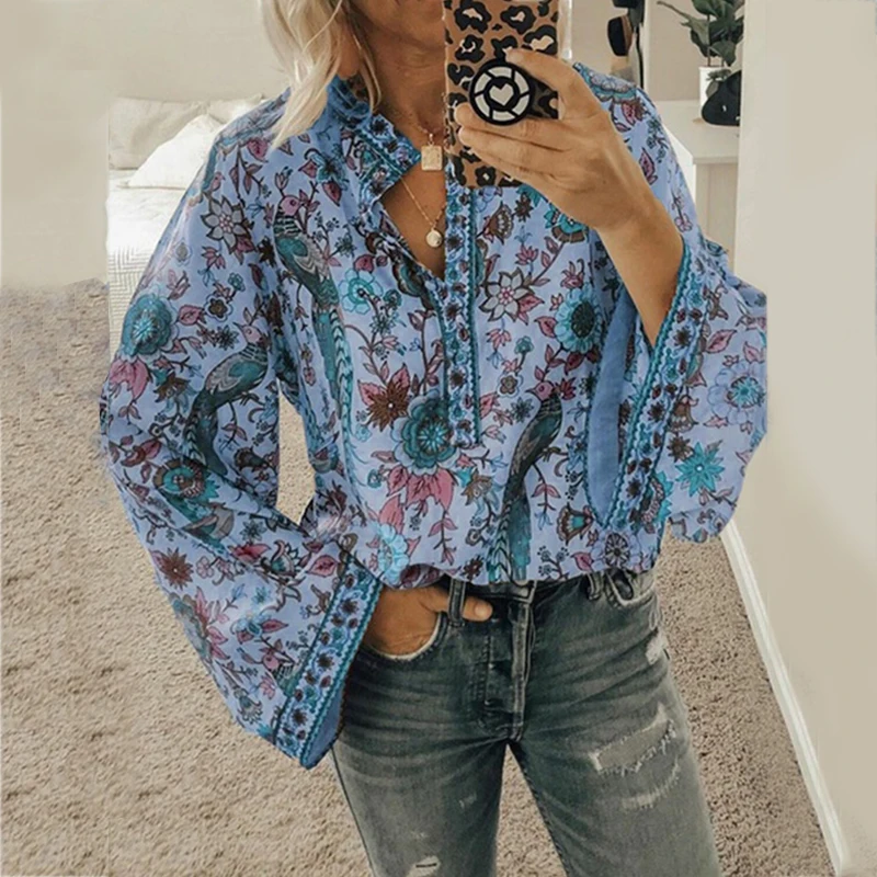 Винтажная Цветочная блузка и рубашка для женщин, повседневная, v-образный вырез, длинный рукав, плюс размер, топы, осенняя блузка, женская, бо...