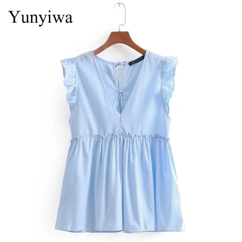 Женская милая плиссированная Повседневная Блузка с v-образным вырезом, без рукавов, с оборками, элегантная кружевная блузка, блузы с бантом на спине, брендовые Топы