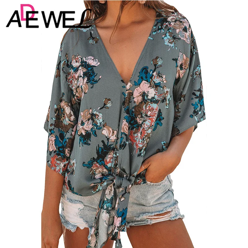 ADEWEL/Летняя и весенняя блузка с цветочным принтом и глубоким v-образным вырезом и завязкой спереди, повседневные свободные офисные женские блузы с рукавами три четверти