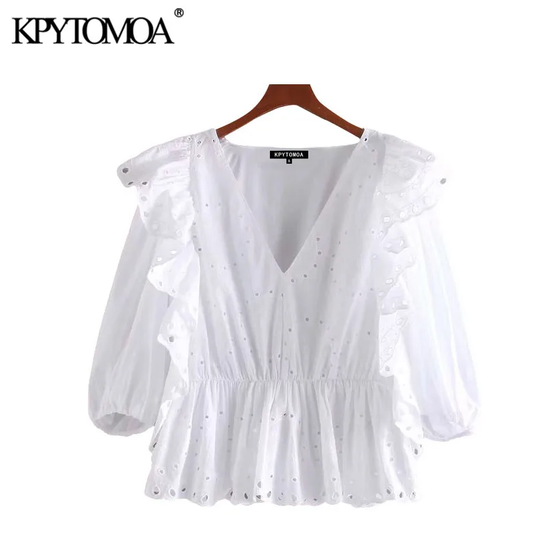 KPYTOMOA Женская милая модная блузка с вышивкой и оборками, винтажные женские рубашки с v-образным вырезом и рукавом до локтя, шикарные топы, 2020