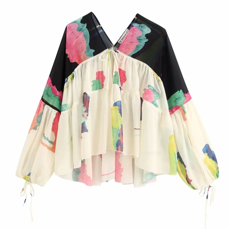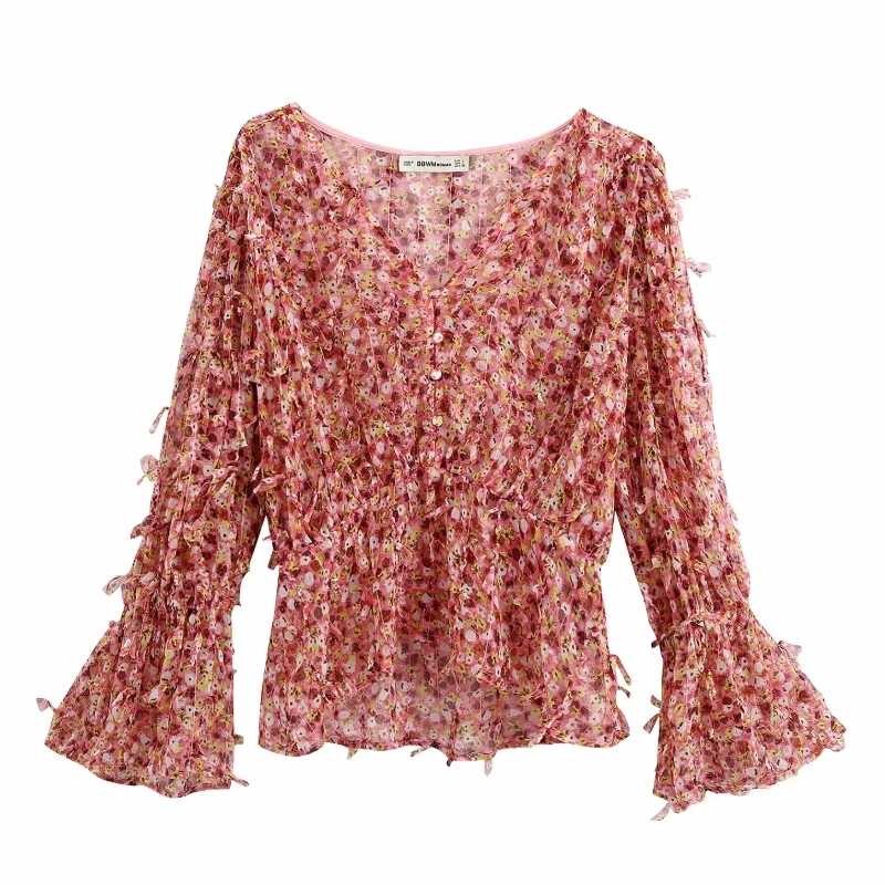 Новинка 2020, женская элегантная шифоновая блузка с v-образным вырезом и Расклешенным рукавом с принтом, женская рубашка с текстурой, для отдыха, шикарная сорочка, топы LS6550