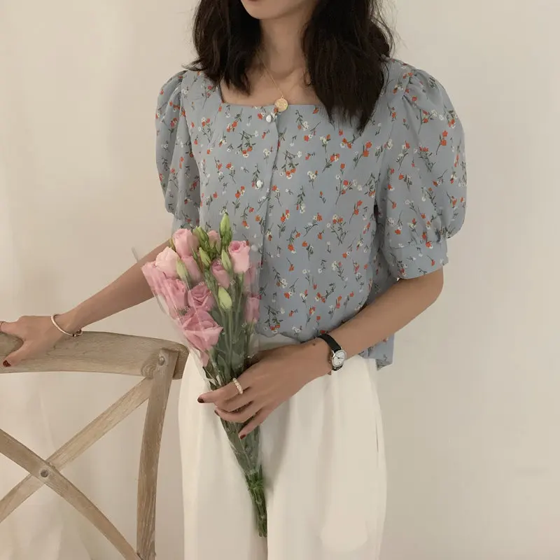 Alien Kitty винтажный милый цветочный принт Лето 2019 Элегантный квадратный вырез рубашки повседневные женские свободные модные Универсальные бл...