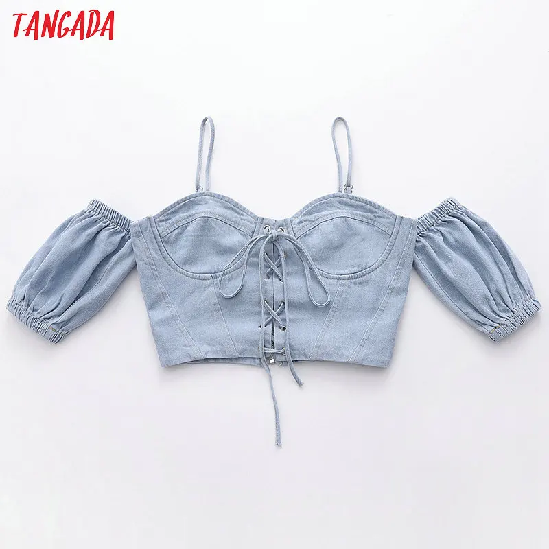 Женская джинсовая укороченная блузка Tangada, с открытыми плечами, с коротким рукавом, в стиле ретро, 2020