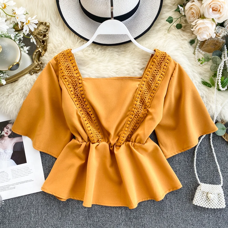 Шикарный ретро квадратный воротник свободный короткий расклешенный рукав тонкий короткий топ рубашка женская однотонная блузка Mujer De блуз...