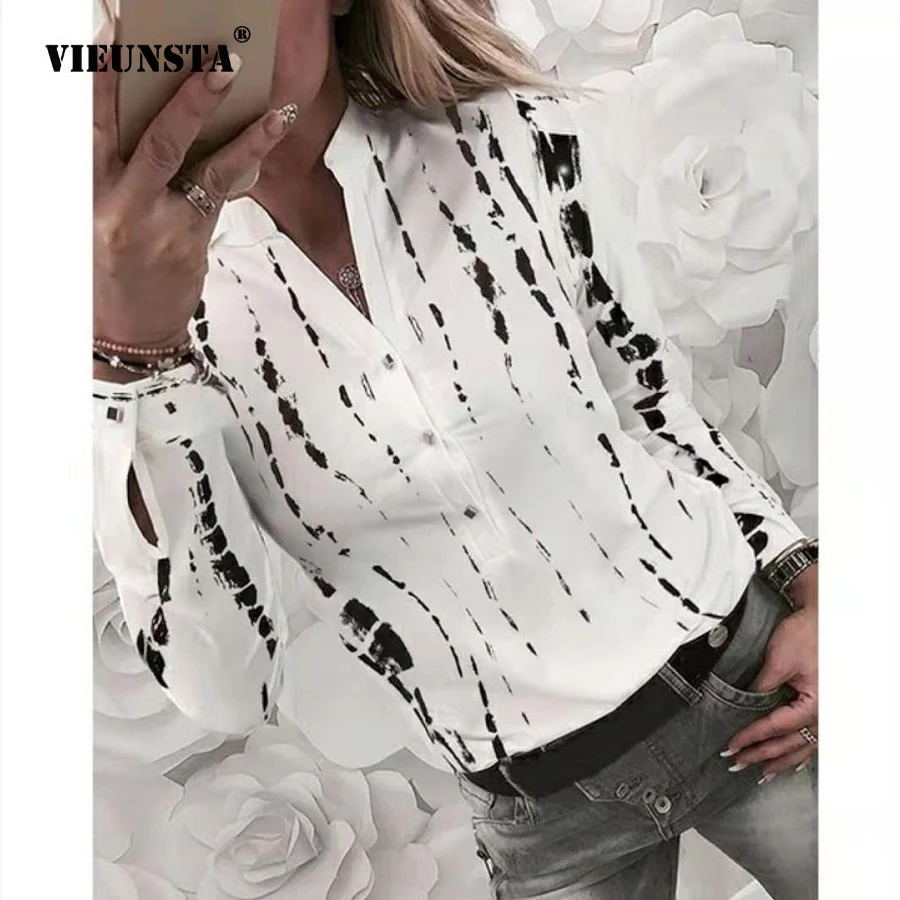 Сексуальная офисная блуза с v-образным вырезом и пуговицами, элегантная рубашка с принтом и длинным рукавом, женские облегающие топы размер...