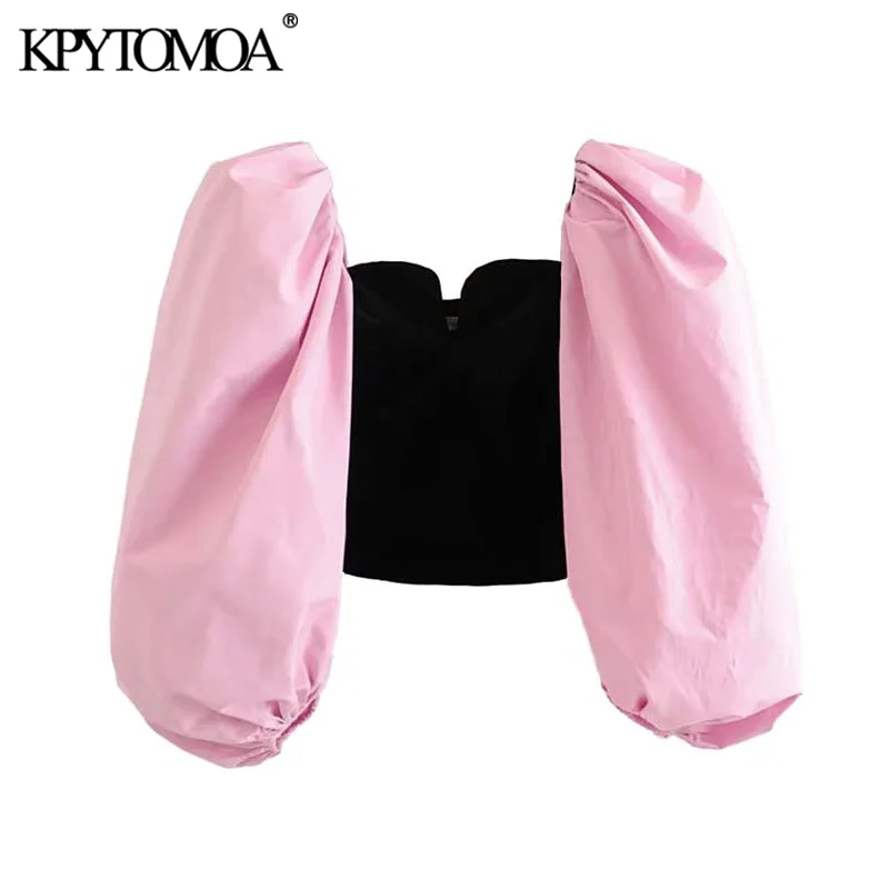 Винтажные стильные Лоскутные Бархатные укороченные блузки для женщин 2020 Модные женские рубашки с v-образным вырезом и пышными рукавами шик...