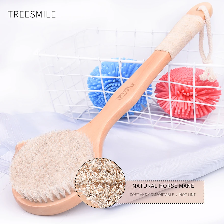 TREESMILE, натуральная Конская шерсть, длинная, противоскользящая ручка, деревянная, для тела, для ухода за здоровьем, щетка для ванны, для тела, скраб, щетка для душа