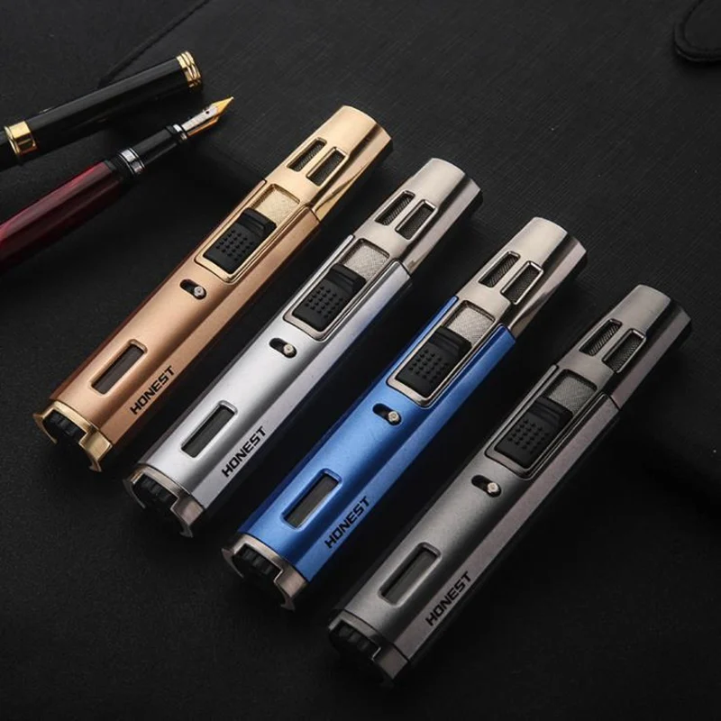 Портативная длинная полоса ветрозащитная Зажигалка для сигарет металлическая газовая зажигалка Бутановая Зажигалка перекрестная двойная прямая синяя зажигалка