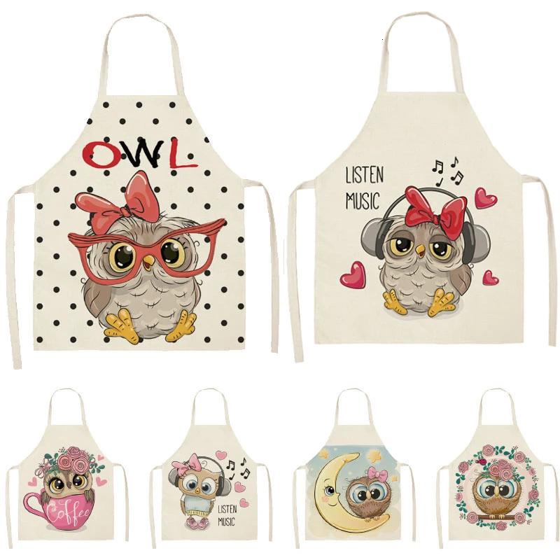 1 шт., хлопковый Льняной Фартук без рукавов с цветочным принтом совы, фартук для кухни, Короткий Передник для женщин, домашний нагрудник для п...