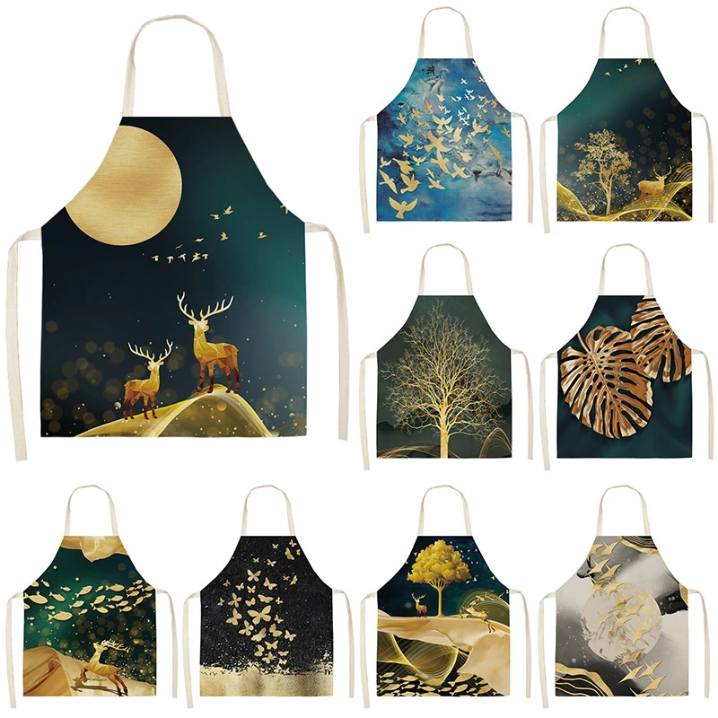 Кухонный Фартук с золотым оленем и бабочкой для женщин, хлопковый льняной нагрудник для домашней уборки, фартук для приготовления пищи, 53*65 см, WQL0190