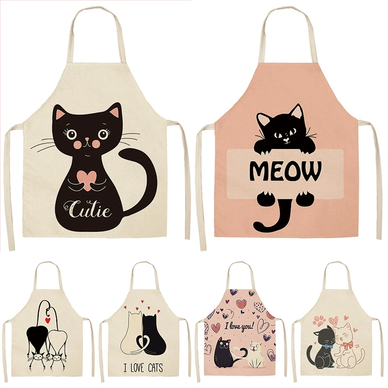 1 шт. Черный Белый Кот Кухонные фартуки для женщин из хлопка и льна нагрудники для домашней уборки фартук для приготовления пищи 53*65 см WQL0123