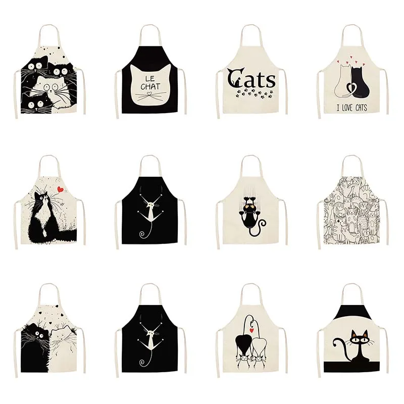 Фартук из хлопка и льна с милым рисунком кота, кухонный нагрудник, забавные фартуки для женщин и мужчин, Аксессуары для выпечки, чистые домашние инструменты c2715