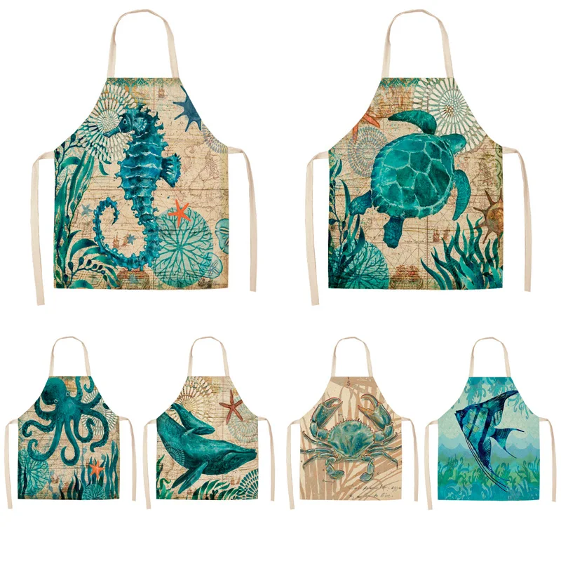 Кухонный Фартук для родителей и детей с принтом черепахи/морского конька/осьминога/рыбы, без рукавов, хлопковые льняные фартуки для детей, м...