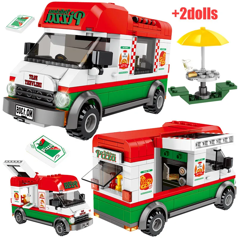 City Street View Pizza Takeaway Car Building Blocks For Legoing Sanitation Cleaning Vehicles Figures Bricks Toys for Children