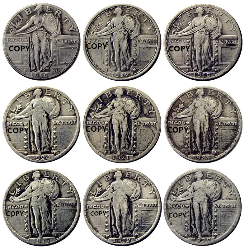 США набор (1916-1924) P/S 9 шт., стоящая четверть свободы Посеребренная копия монеты