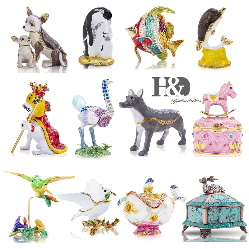 H&D, 12 стилей, ручная роспись, эмаль, животный узор, шарнирная металлическая коробка для безделушек, Ювелирное кольцо, дисплей, коллекционное, ...