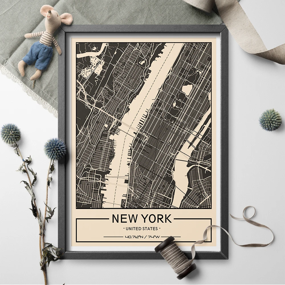 Ретро Картина на холсте Настенная картина на заказ Печать Мир Нью-Йорк город искусство карта холст печать картина домашний декор Безрамное