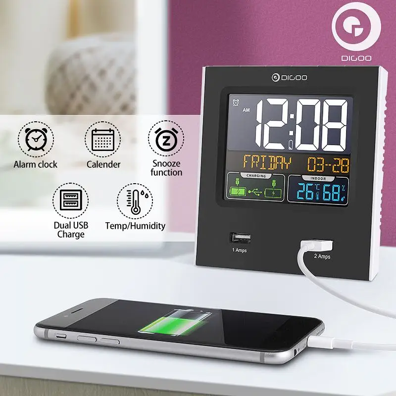 Digoo DG-C3X повтора будильника + Dual USB Порты и разъёмы/Календарь/светодиодный Подсветка/12/24hr/Температура влажности Дисплей °C/°F