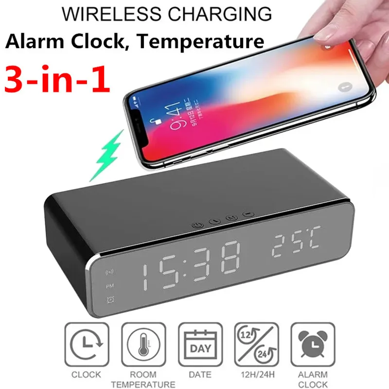 Настольная Беспроводная зарядка будильник для Samsung для Xiaomi для Huawei для iPhone электрический USB цифровой 12/24 ч светодиодный термометр Дата