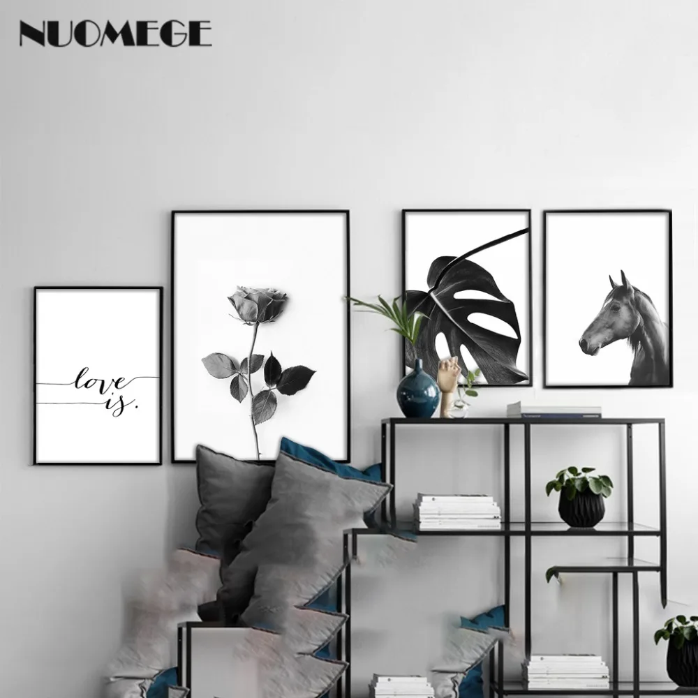 Черный и белый лошадь настенные цветок холст печати плакатов Nordic Стиль любовь простая роспись стены картину для Декор в гостиную