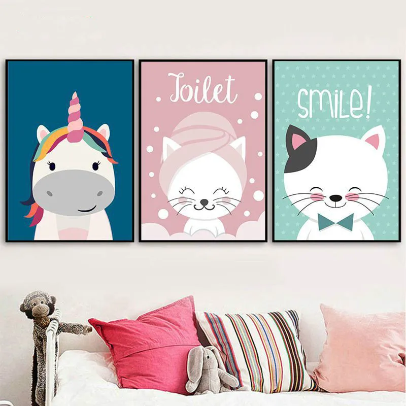 Мультяшный Кот Единорог искусство Декоративные плакаты гостиная детская спальня бескаркасная картина холст настенное искусство Назад в б...