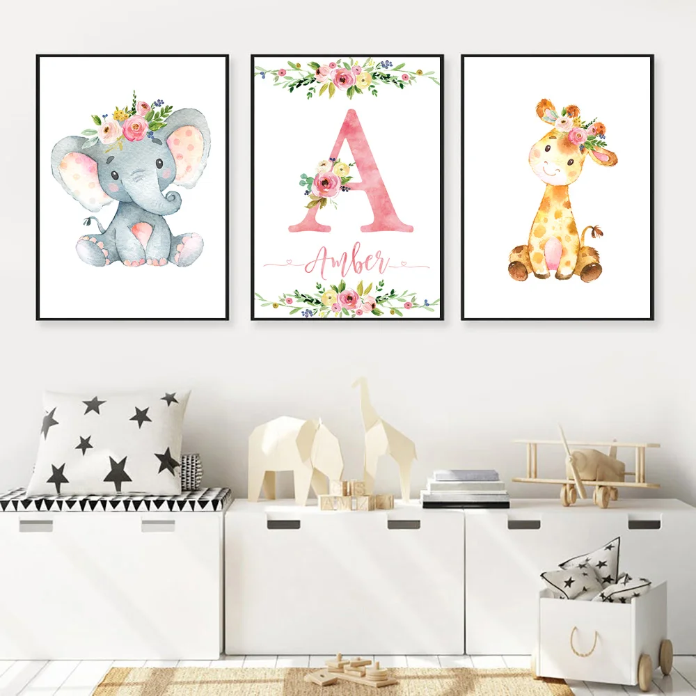 Скандинавский постер на заказ, постеры с именем и принтами, цветы, слон для детской комнаты, холст, картина, настенные художественные картины для маленькой девочки, декор для комнаты