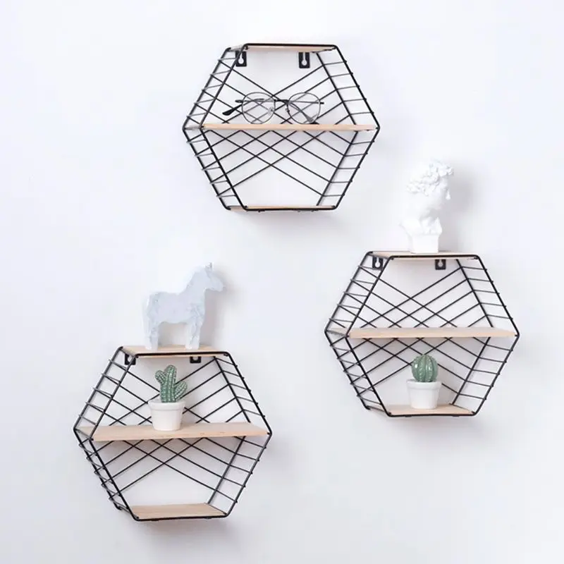 Настенная полка современная простая Геометрическая деревянная металлическая проволока Шестигранная полка для хранения цветов дисплей ид...