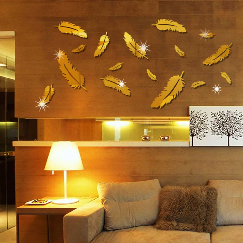 Дизайнерские настенные наклейки золотистого цвета с 3D зеркалом, 8 шт., украшение для комнаты, детское ремесло, перо, детское творческое зерка...