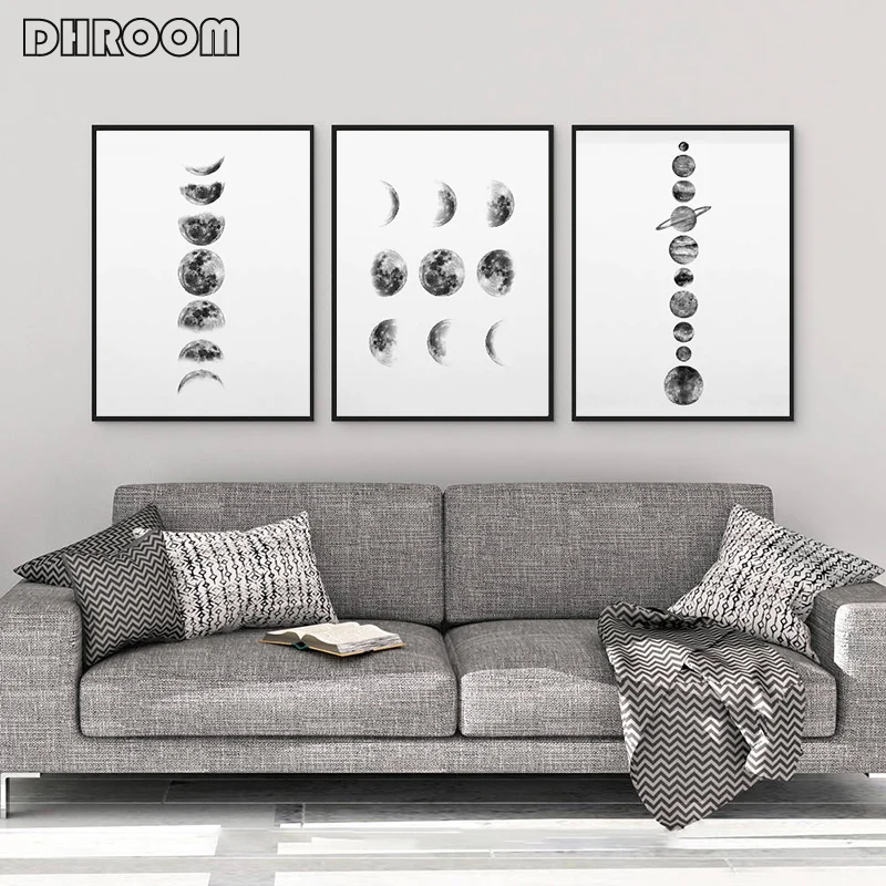 Солнечная система настенное искусство черно-белая луна фазы холст художественные принты минималистский постер на космическую тематику живопись для гостиной домашний декор
