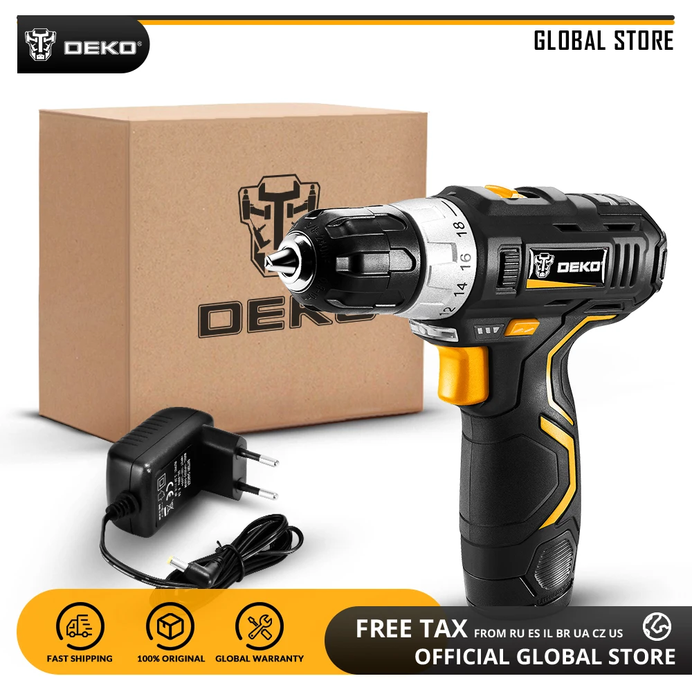 DEKO 12 в 16 В 20 в электрическая отвертка с литиевой батареей Аккумуляторные дрели электроинструменты для деревообработки крутящий момент 18 + 1 настройки