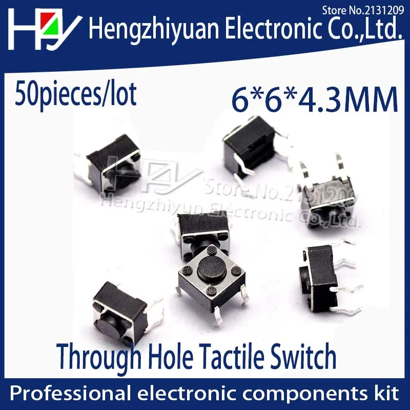 4-контактный тактильный такт Hzy 6x6x4,3 мм, Микропереключатель с прямым включением, самосброс, погружение в верхнее отверстие, медный тактильный переключатель