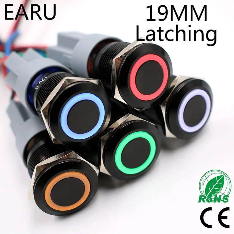 1 шт. 19 мм мощная черная Водонепроницаемая фиксация самоблокирующийся металлический кнопочный переключатель светодиодный светильник 5 в 12 В 24 В 220 В красный синий зеленый