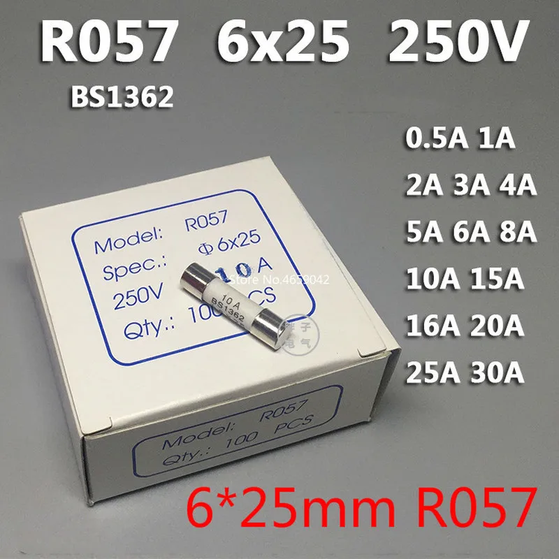 10 шт. R057 6*25 мм Быстрый плавкий предохранитель Керамика предохранитель 6x25 предохранитель 250V 0.5A 1A 2A 3A 4A 5A 6A 8A 10A 13A 15A 16A 20A 25A 30A