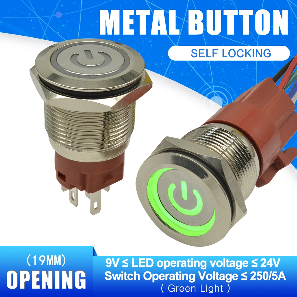19 мм кнопочный переключатель 250 В 5A с автоматической блокировкой и фиксацией круглый зеленый светодиодный кольцевой выключатель света с си...