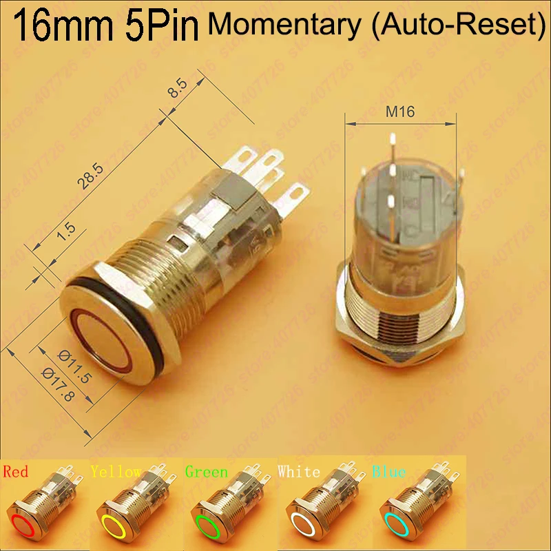 1 шт. 16 мм Мощность начать металлический переключатель мгновенный Самостоятельная Сброс кольцо индикация 5pin LED 12 В/24 В для автомобилей Даш/мо...