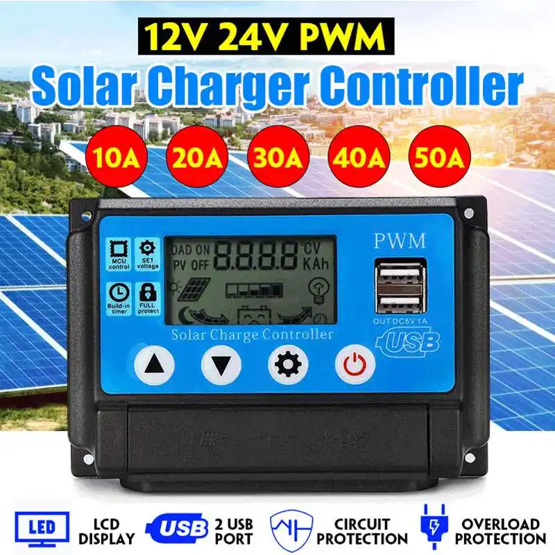 10A/20A/30A/40A/50A/60A 12V 24V двойной usb-авто за максимальной точкой мощности, Солнечный контроллер заряда ШИМ-контроллеры ЖК-дисплей 5V Выход обжимной и...