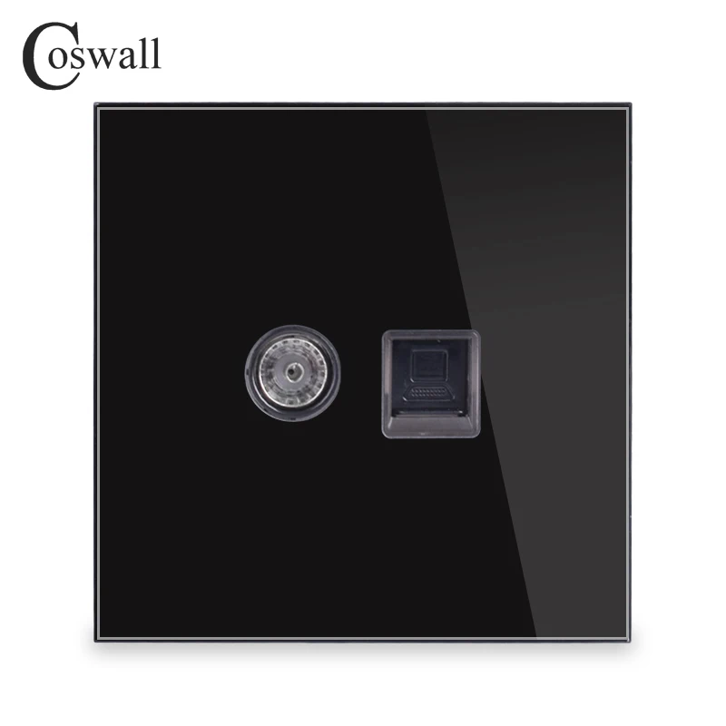 Coswall Кристалл закаленное Стекло Панель RJ45 CAT5E Интернет Jack с ТВ розетки компьютерных данных гнездо черный R11 серии