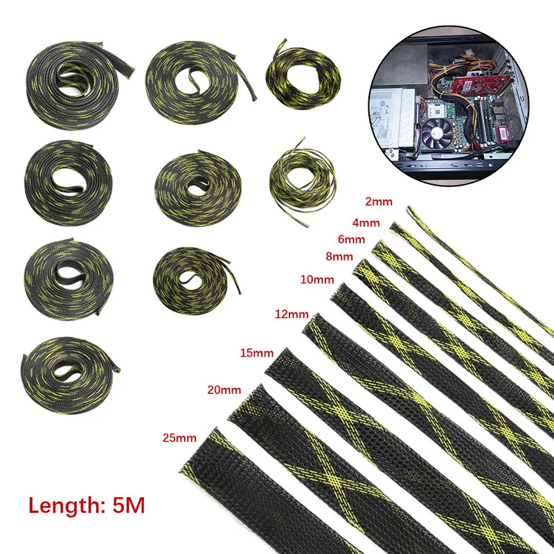 5 м жёлтый и черный плетеный рукав 2/4/6/8/10/12/15/20/25 мм расширяемый изоляционный плотный защитный кабельный рукав