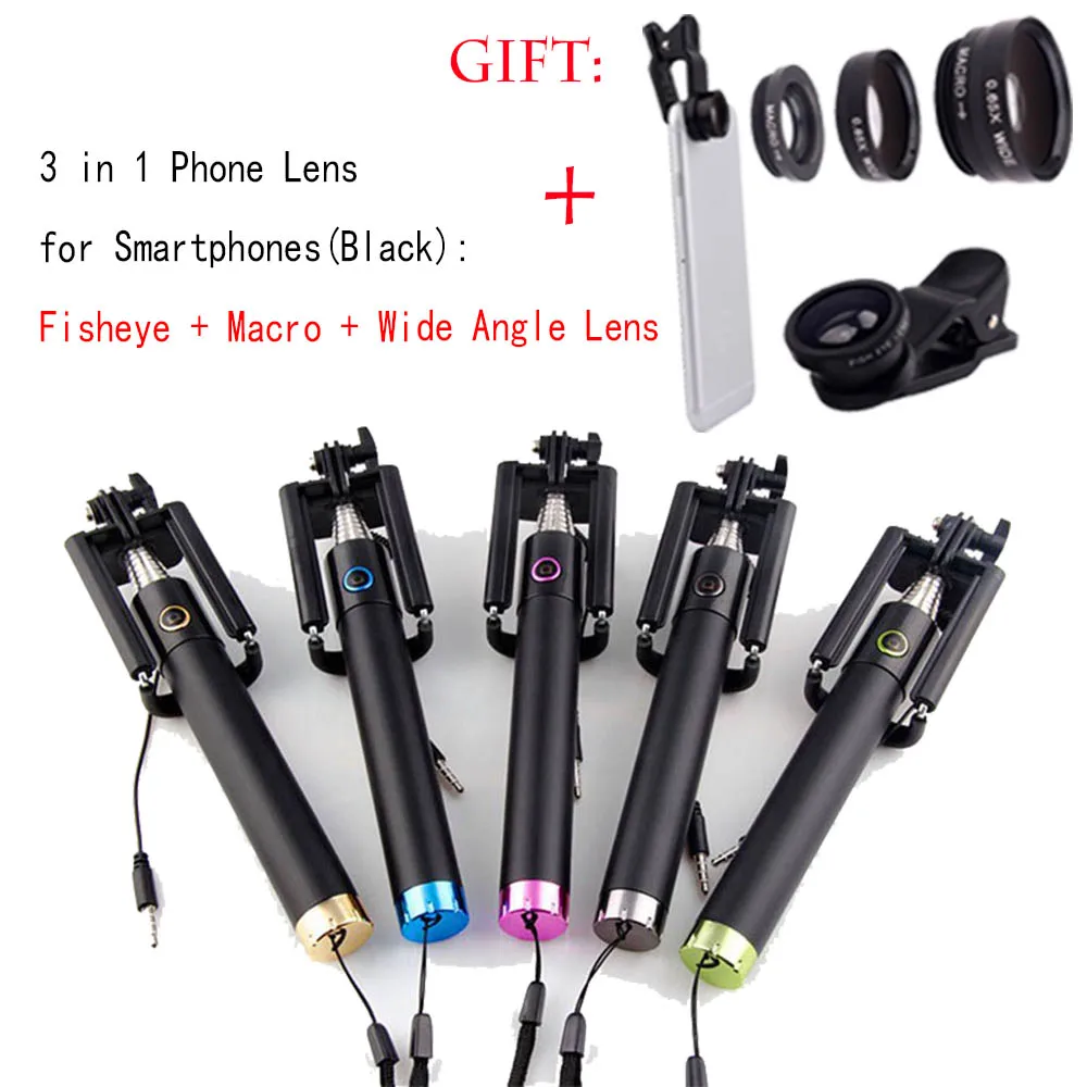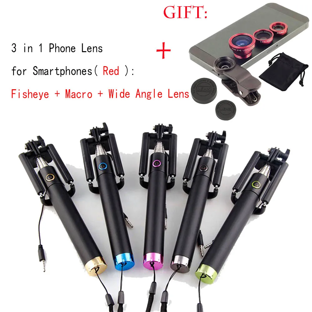 4 в 1 проводной палка для селфи штатив встроенный затвор монопод + Рыбий глаз Макро Широкий формат телефона объектива для Samsung Galaxy A9 a8 A7 a5 a3