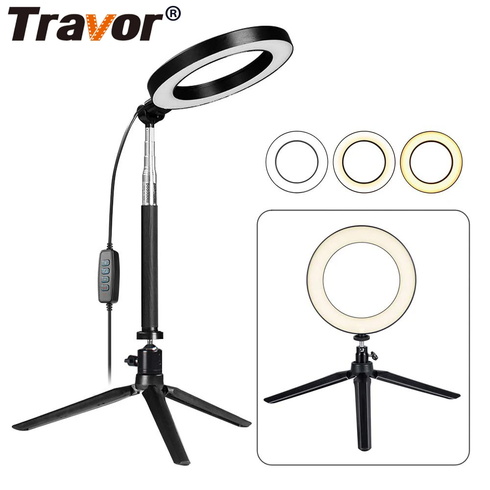 Travor светодиодный 6-inch кольцо с регулируемой яркостью света Таблица круглая лампа с растягивающийся штатив Стенд селфи палка для селфи, маки...