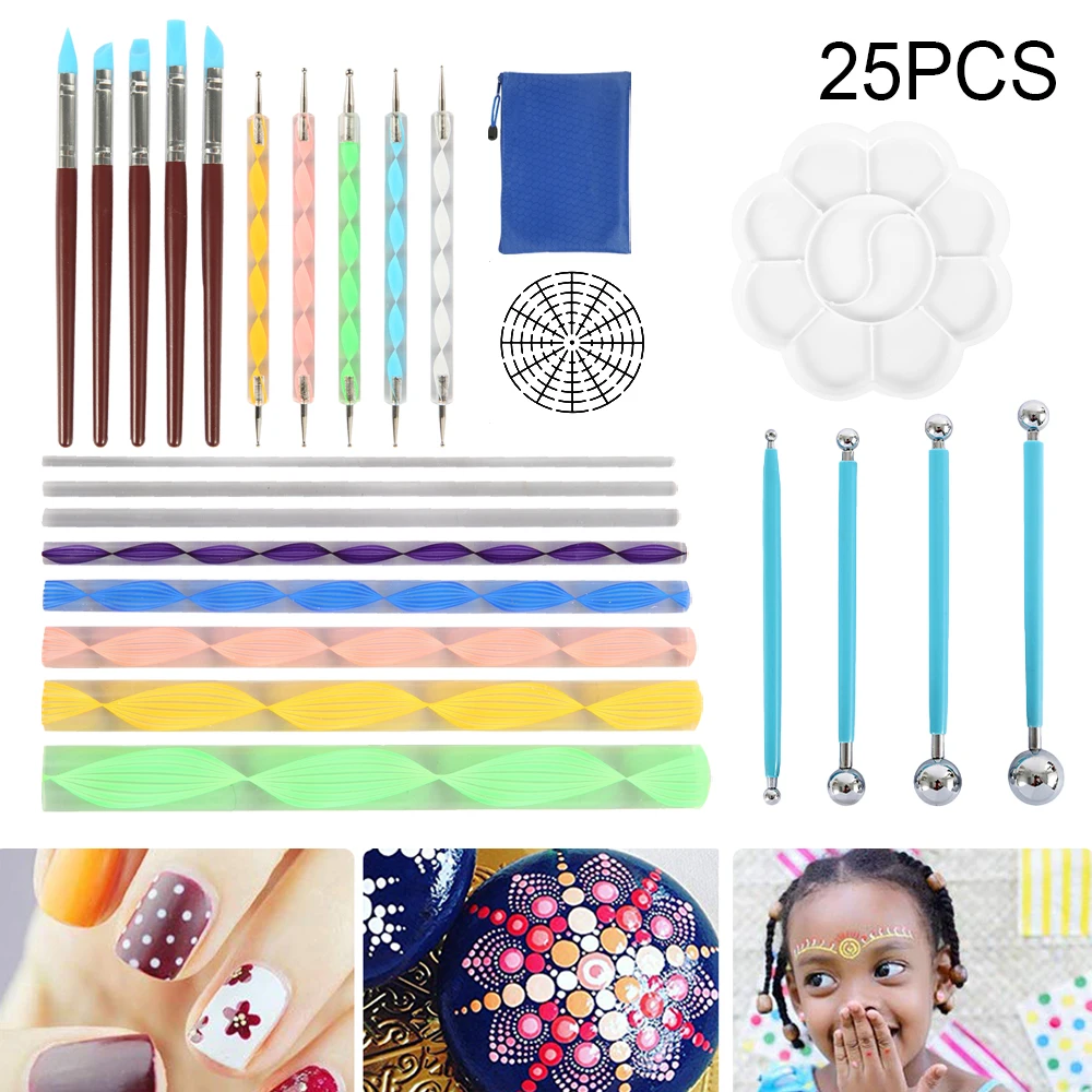 25 шт., набор инструментов для рисования мандалы, набор инструментов для рисования в горошек, наборы кистей для рисования, лоток для краски, кисти для нанесения краски, холст, камни, ткань, искусство