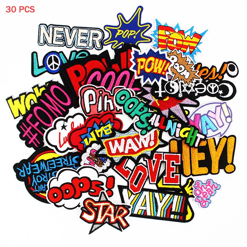 Оптовая продажа, нашивки с вышитыми буквами, железные значки, тканевые наклейки ручной работы для одежды, куртки, DIY Аппликации, 30 шт. в партии