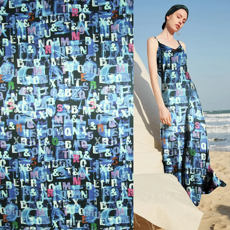 Модные синие слова печати шелк, хлопок, сатин смешанная ткань удобные, SCT572