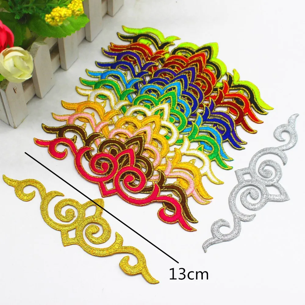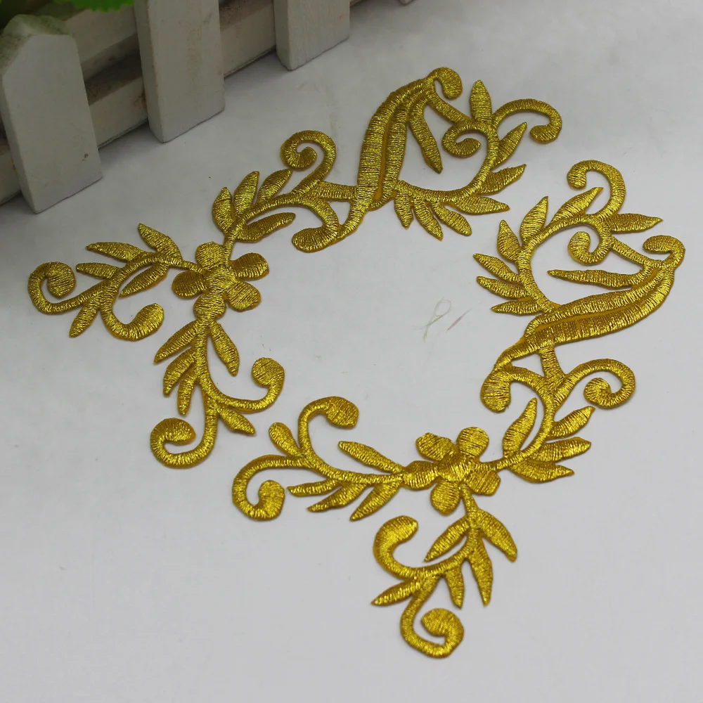 Золотая вышивка аппликация Косплей Diy зеркальная пара железо на цветке планки 10 пар/лот золото металлические нашивки 12,8 см-6,5 см