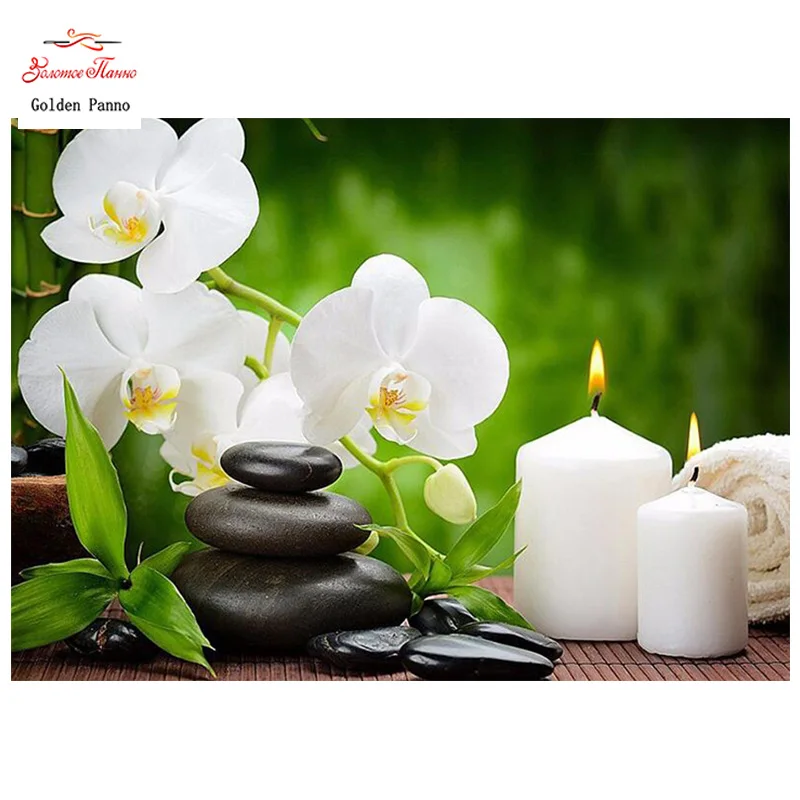 Новый полный квадратный алмаз 5D DIY алмазной живописи "Орхидея Свечи Камни" Вышивка вышивки крестом горный хрусталь мозаика живопись подарок