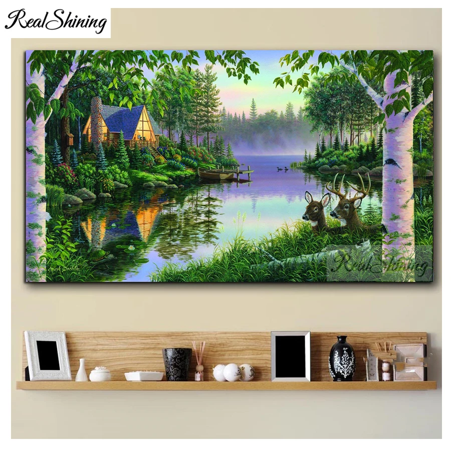 Лес зеленые деревья полный квадрат/круглый Дрель Большой Домик по речке 5d diy алмазная живопись природный пейзаж мозаика Набор для вышивки