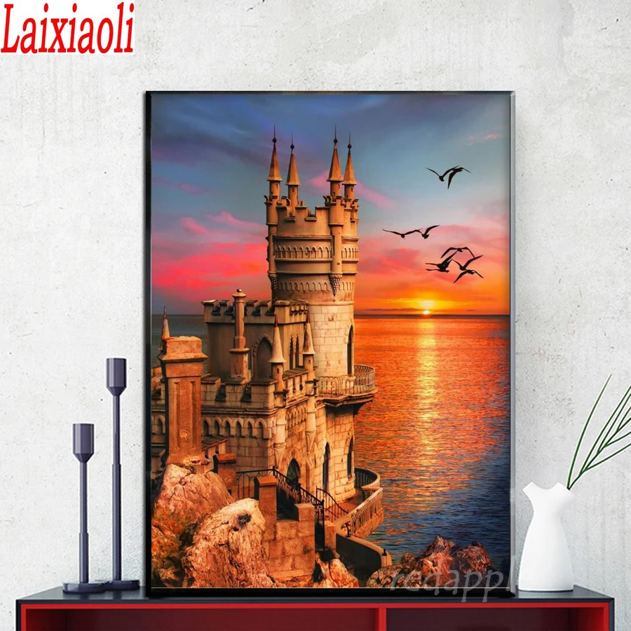 5D алмазная картина, живописный замок у моря, полная дрель, квадратные круглые алмазные стразы, картина, вышивка, мозаика, вышивка крестиком